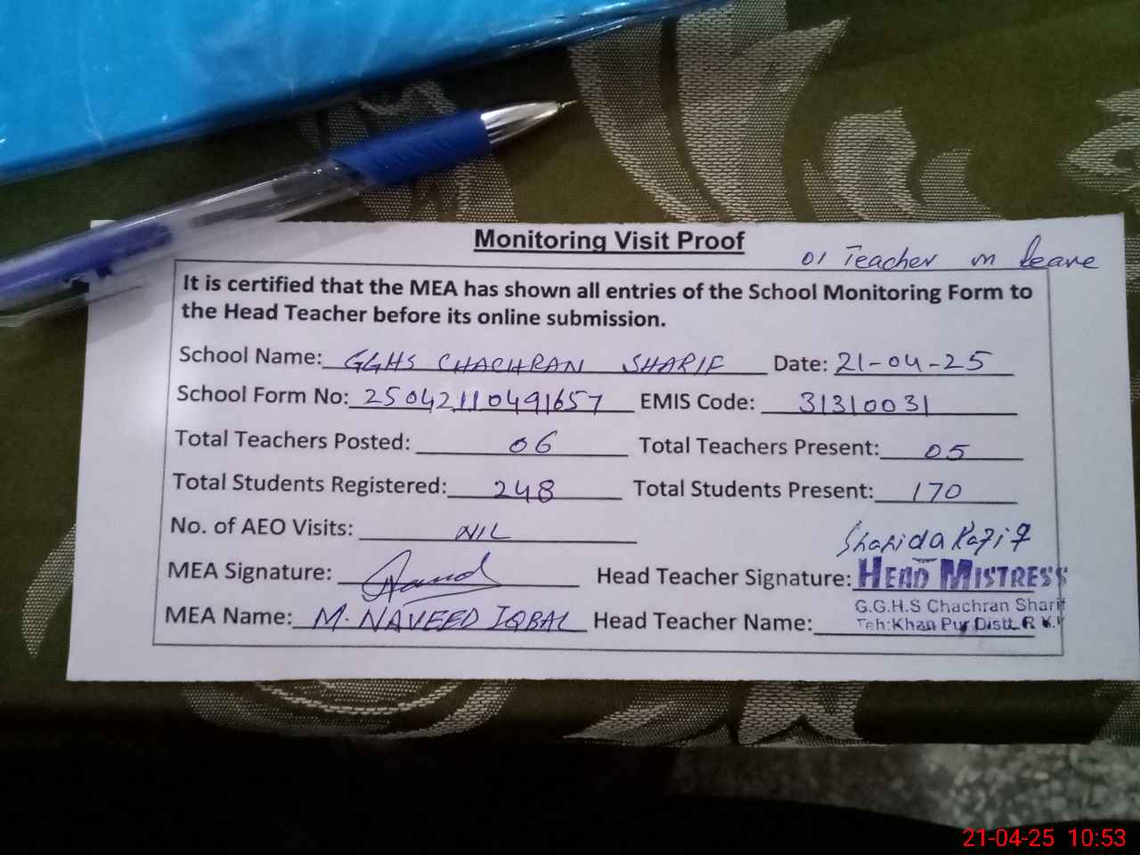 | Attendance Register | Head Teacher | MEA with School | Visit Proof |