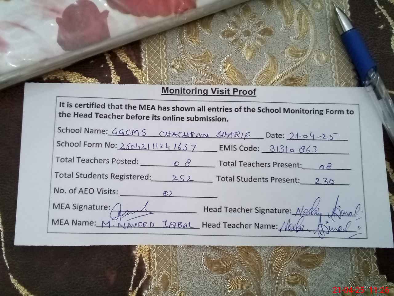 | Attendance Register | Head Teacher | MEA with School | Visit Proof |