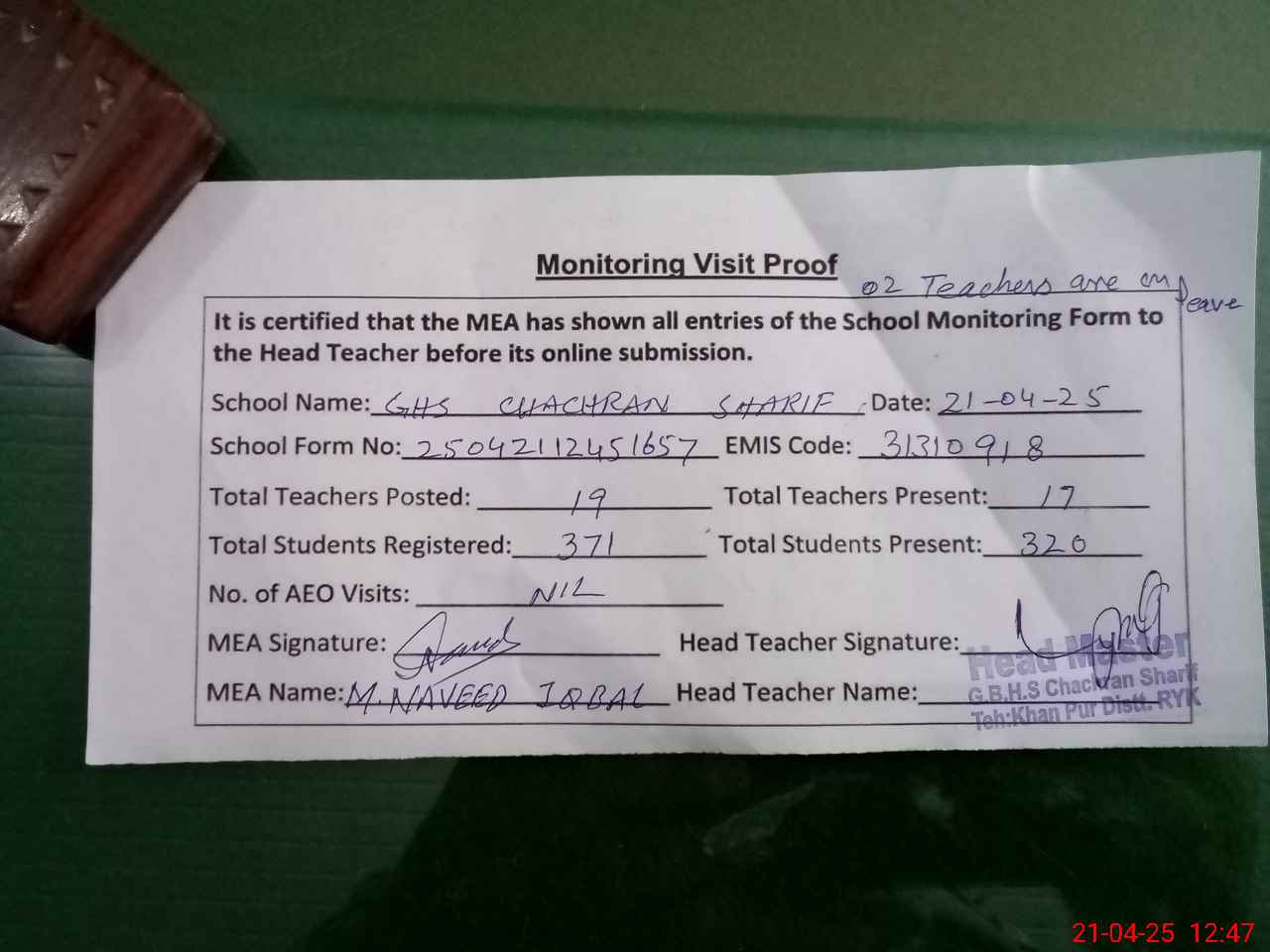 | Attendance Register | Head Teacher | MEA with School | Visit Proof |