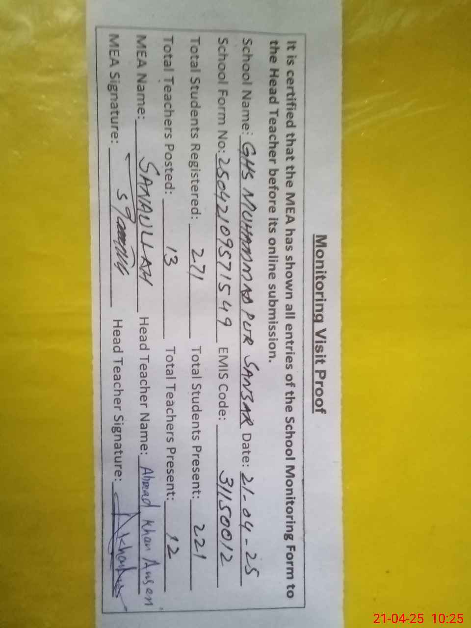 | Attendance Register | Head Teacher | MEA with School | Visit Proof |