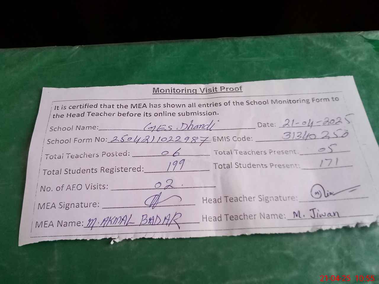 | District: RAHIMYAR KHAN | Tehsil: SADIQABAD | Markaz: DHANDI - MALE | Level: Middle | |