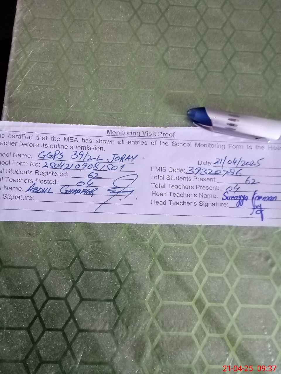 | Attendance Register | Head Teacher | MEA with School | Visit Proof |