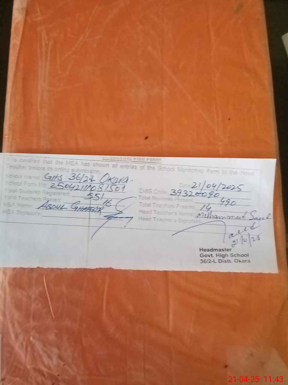| Certified that this School was Inspected by the Undersigned MEA/DMO Today and the Information Stated Above is as Per Record. | |||||