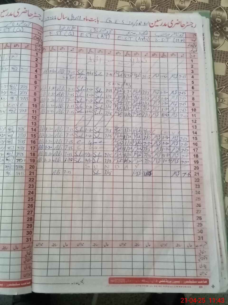 | CNIC | Full Name | Designation | R/C | Absence During Last Calender Month |