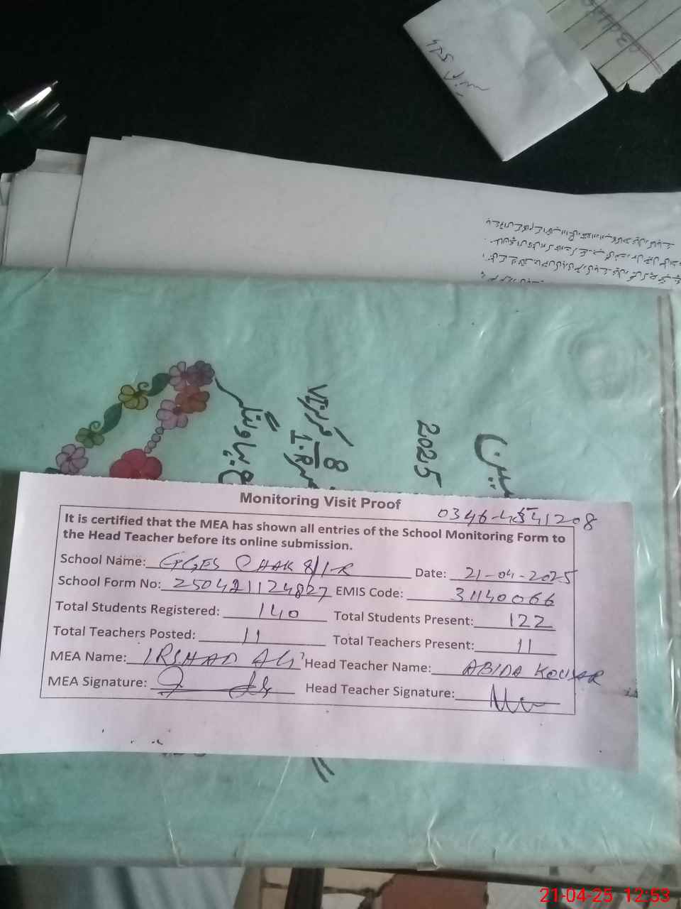| Attendance Register | Head Teacher | MEA with School | Visit Proof |