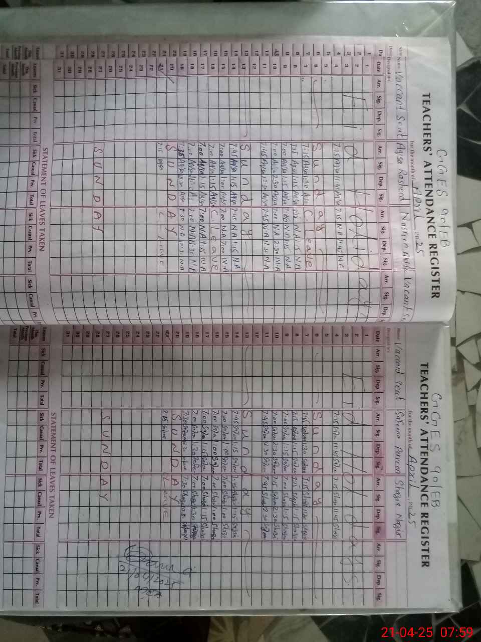 | Leave | Duty | Absent | Maternity | Medical | Ex- Pak |