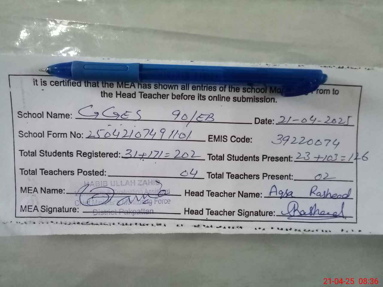 | Attendance Register | Head Teacher | MEA with School | Visit Proof |