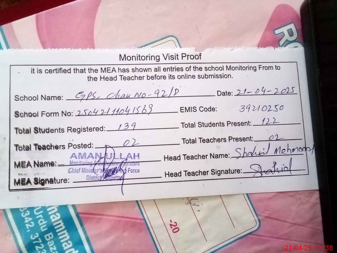 | Attendance Register | Head Teacher | MEA with School | Visit Proof |