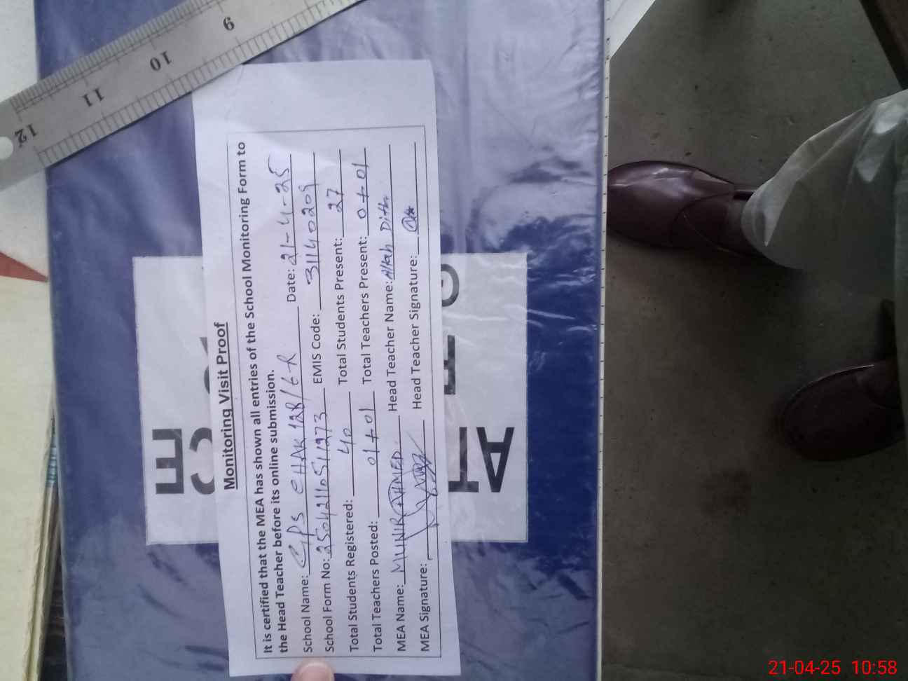 | Attendance Register | Head Teacher | MEA with School | Visit Proof |