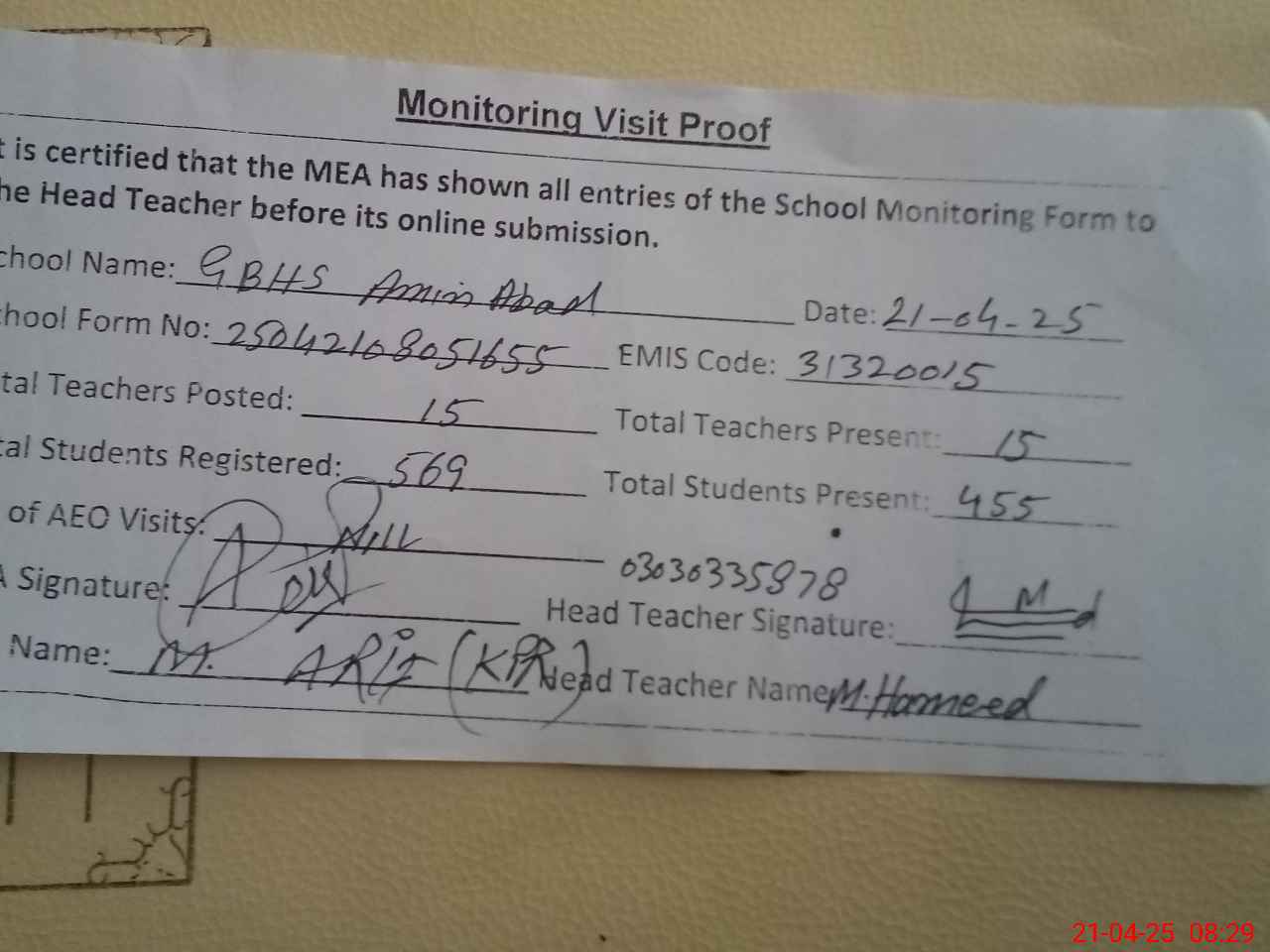 | Attendance Register | Head Teacher | MEA with School | Visit Proof |