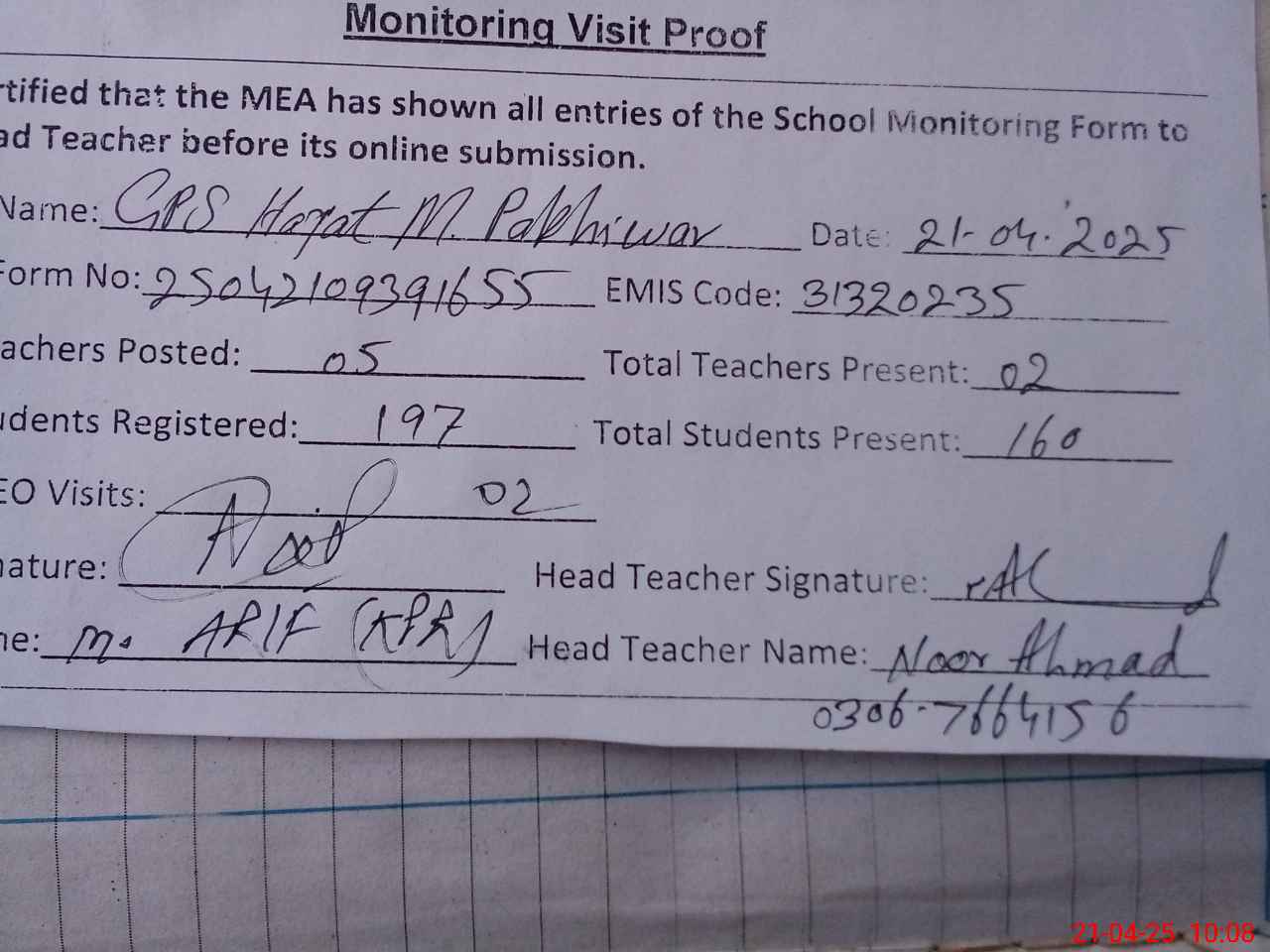 | Attendance Register | Head Teacher | MEA with School | Visit Proof |