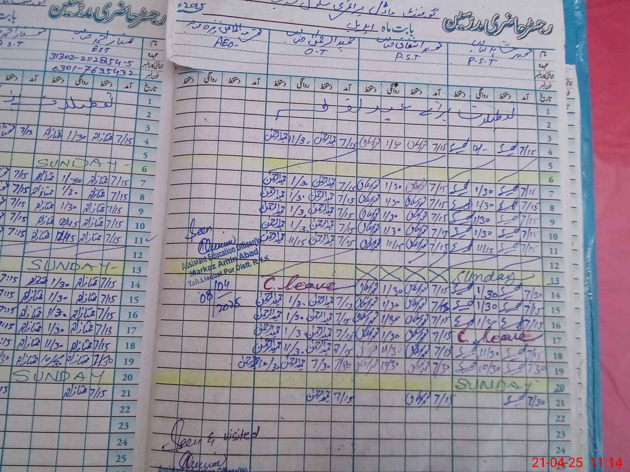 | CNIC | Full Name | Designation | R/C | Absence During Last Calender Month |