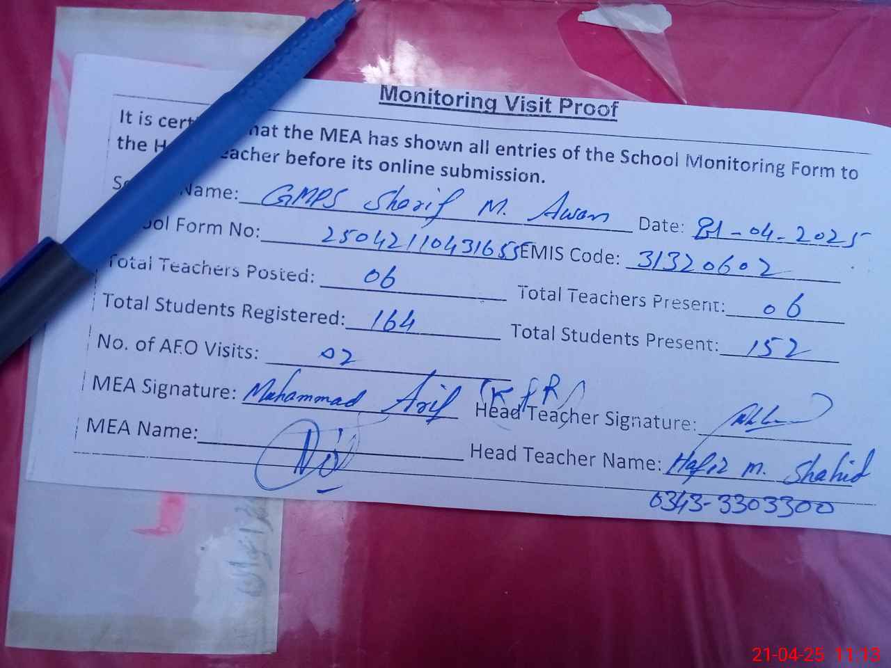 | Attendance Register | Head Teacher | MEA with School | Visit Proof |