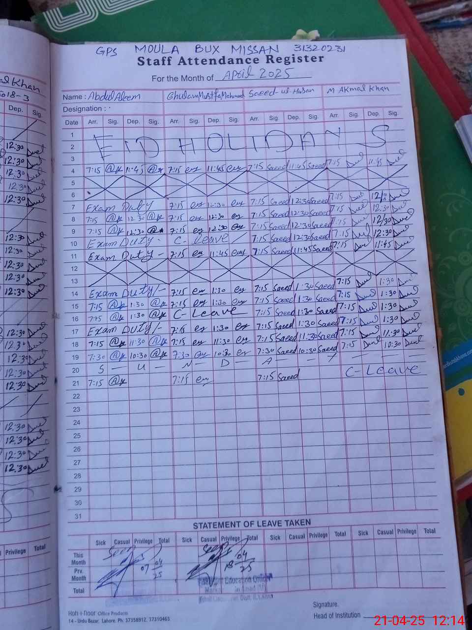 | CNIC | Full Name | Designation | R/C | Absence During Last Calender Month |