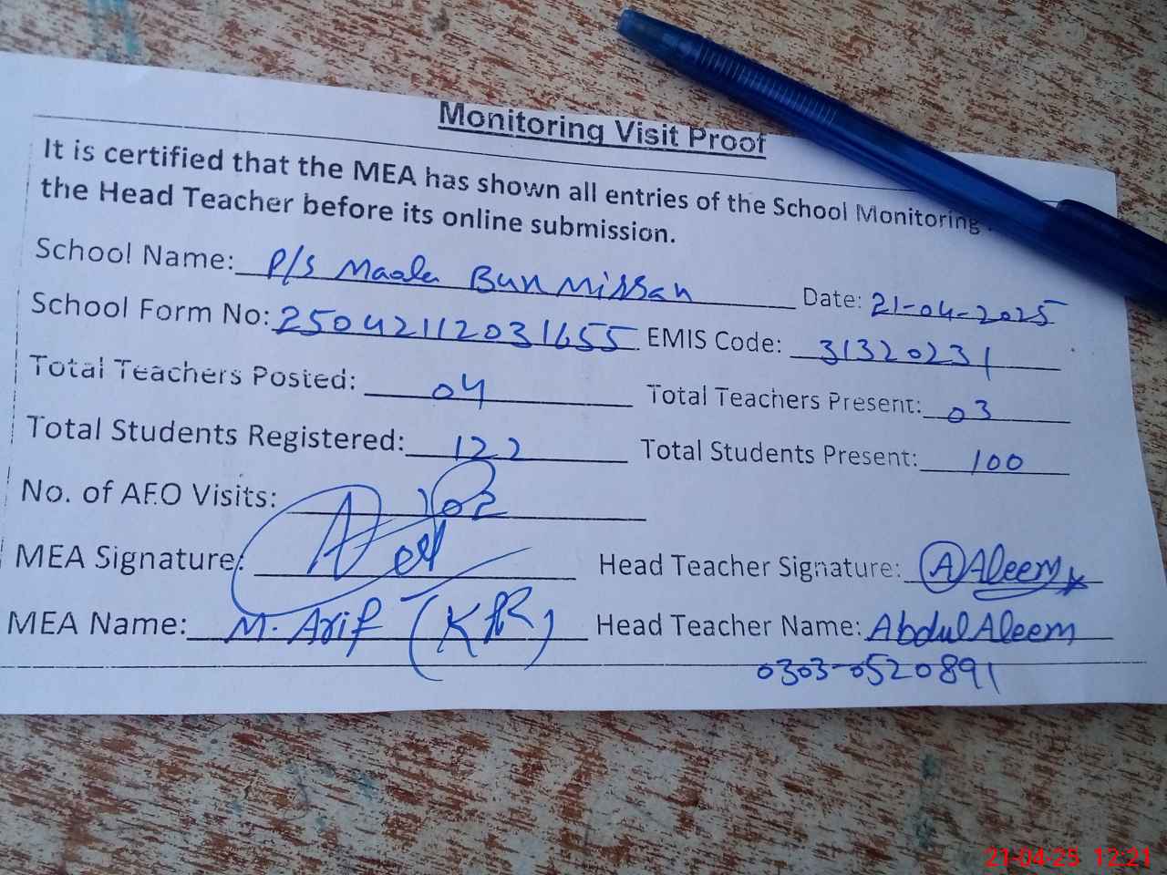 | Attendance Register | Head Teacher | MEA with School | Visit Proof |