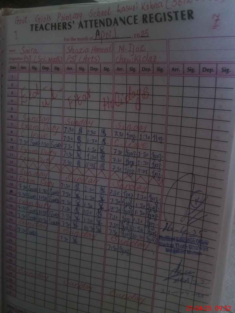 | CNIC | Full Name | Designation | R/C | Absence During Last Calender Month |