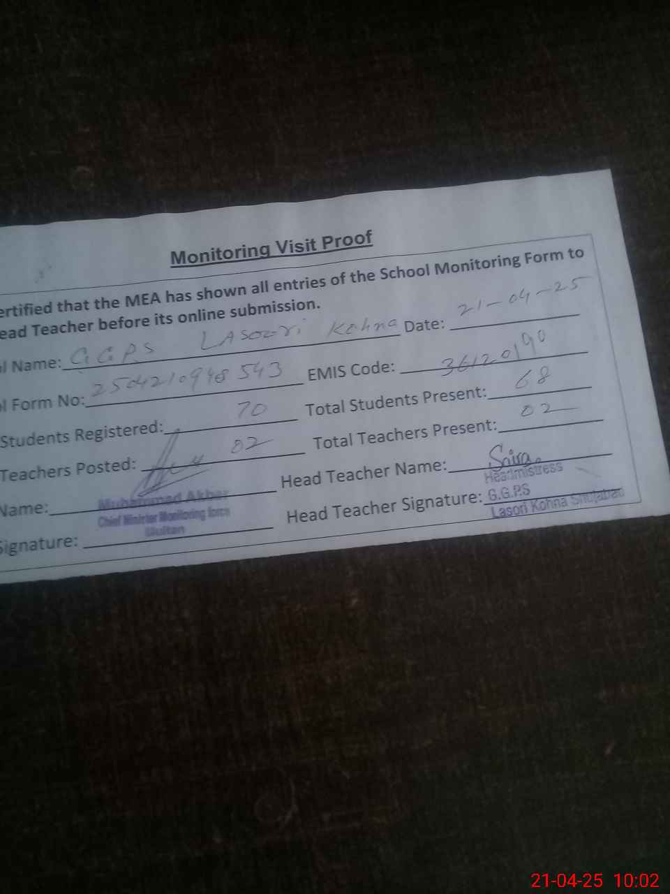| Attendance Register | Head Teacher | MEA with School | Visit Proof |