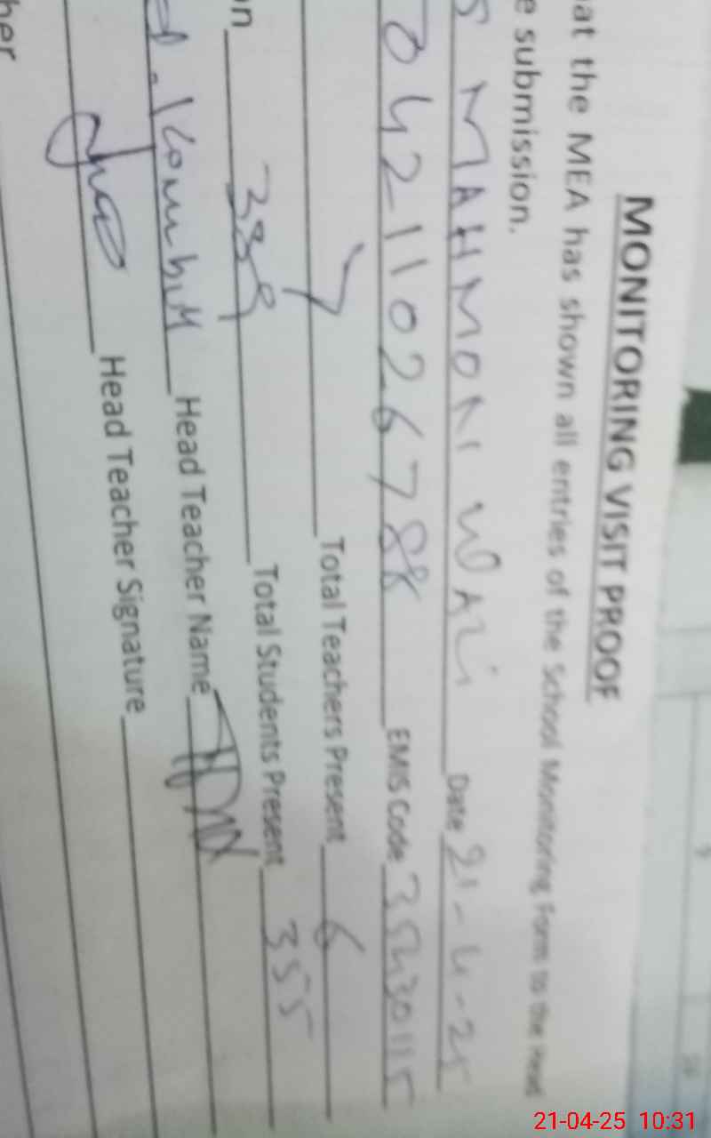 | Attendance Register | Head Teacher | MEA with School | Visit Proof |
