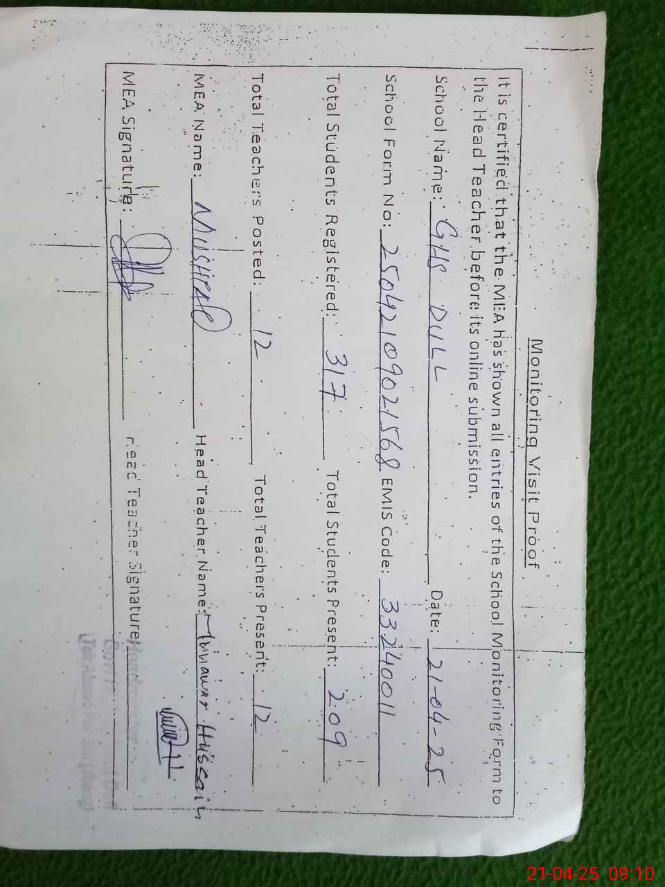 | EMIS Code: 33240011 | Name of School: GHS DULL | |||