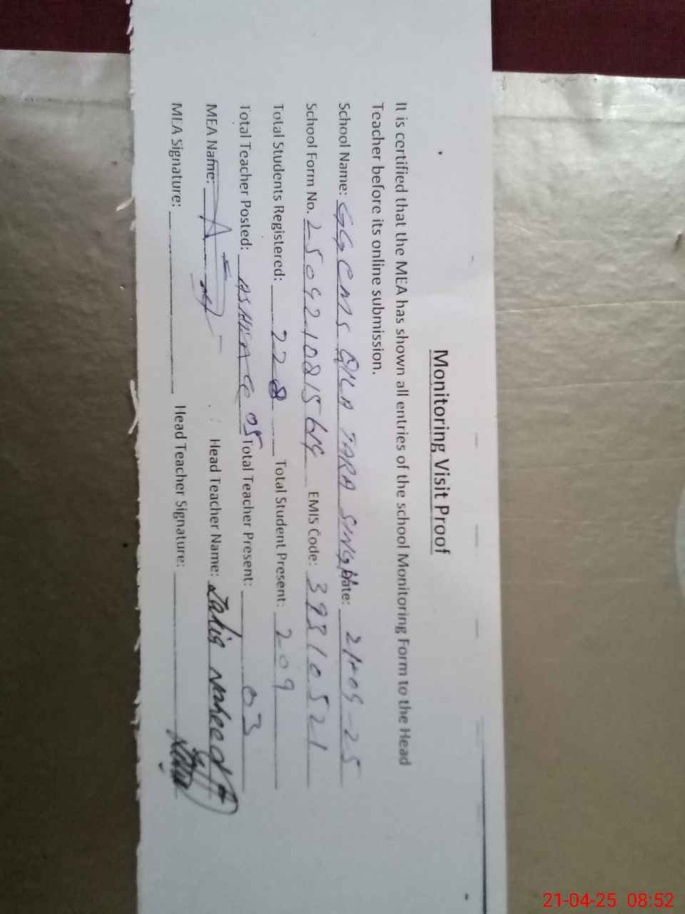 | Attendance Register | Head Teacher | MEA with School | Visit Proof |