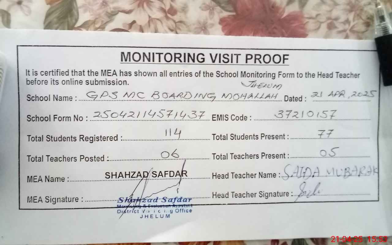 | EMIS Code: 37210157 | Name of School: GPS MC BOARDING MOHALLAH JHELUM | |||