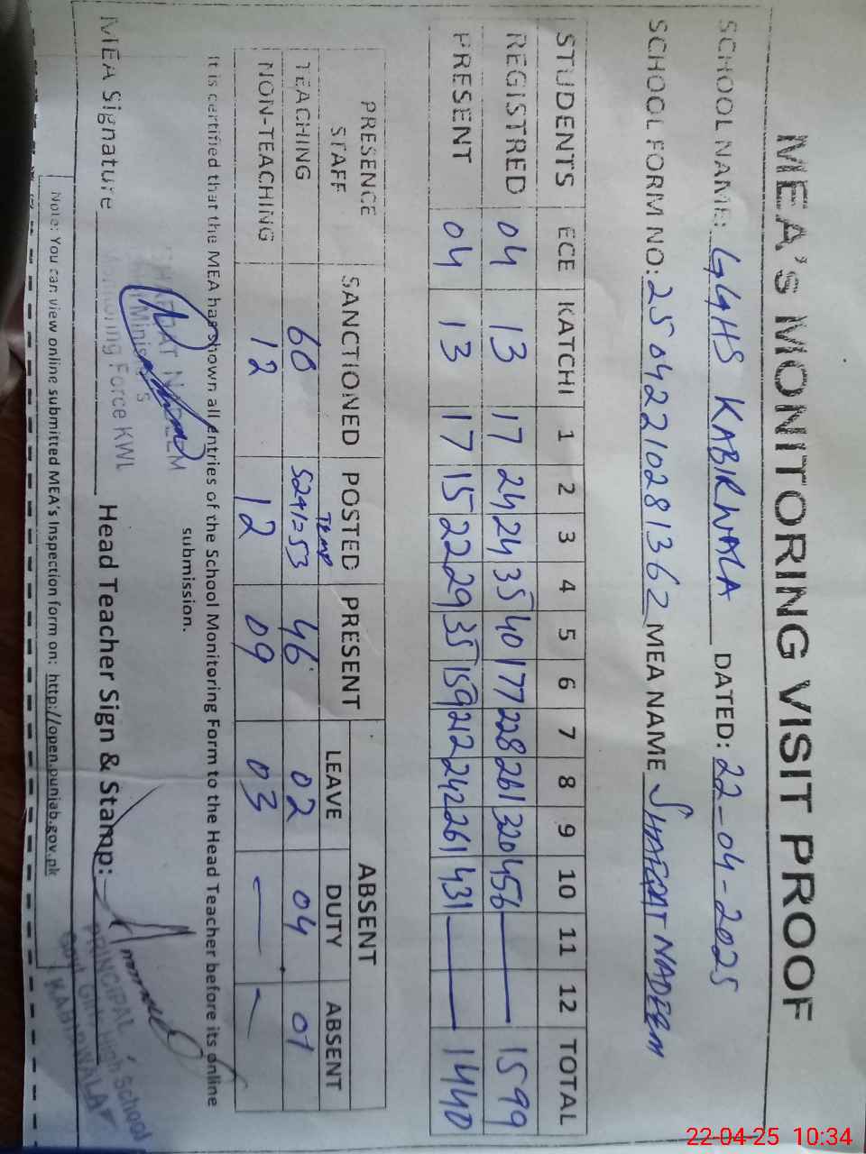 | Attendance Register | Head Teacher | MEA with School | Visit Proof |