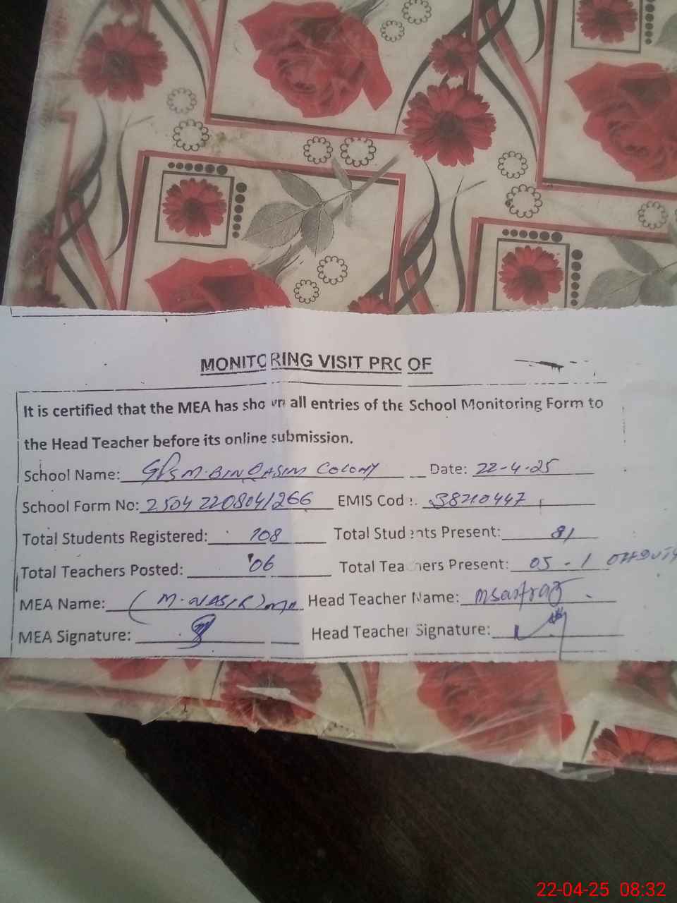 | EMIS Code: 38210447 | Name of School: GPS MUHAMMAD BIN QASIM COLONY | |||