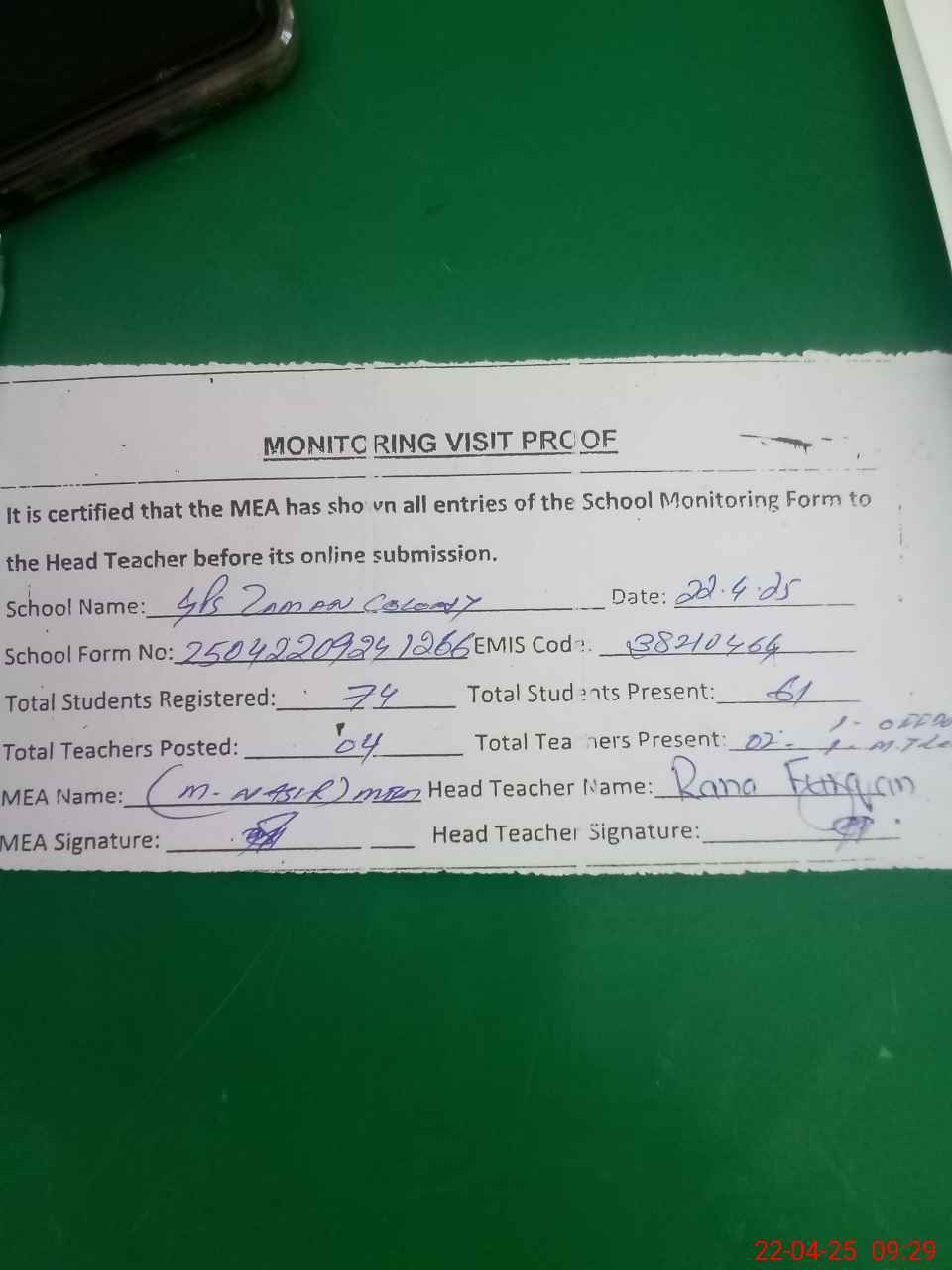| Attendance Register | Head Teacher | MEA with School | Visit Proof |