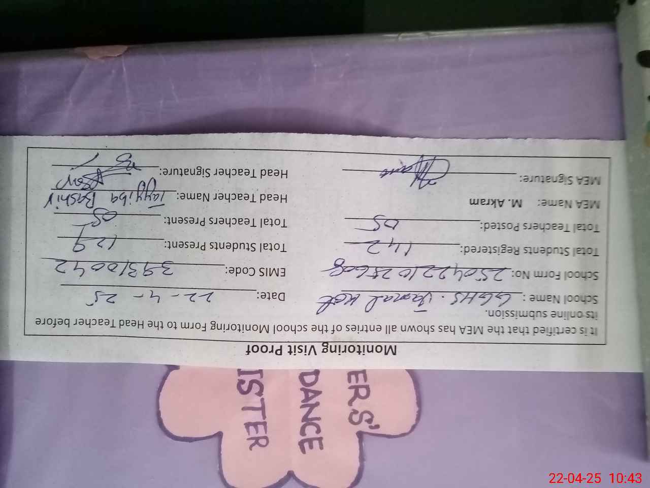 | Attendance Register | Head Teacher | MEA with School | Visit Proof |