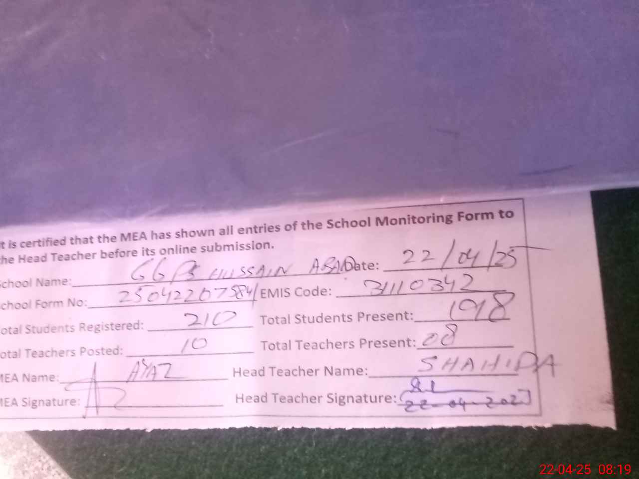 | Attendance Register | Head Teacher | MEA with School | Visit Proof |