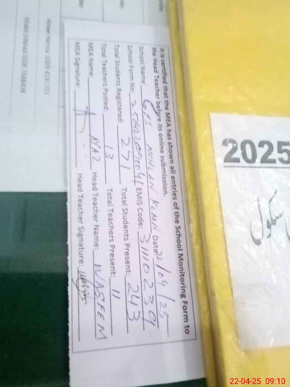| EMIS Code: 31110239 | Name of School: GES MOHLAN KALAN | |||