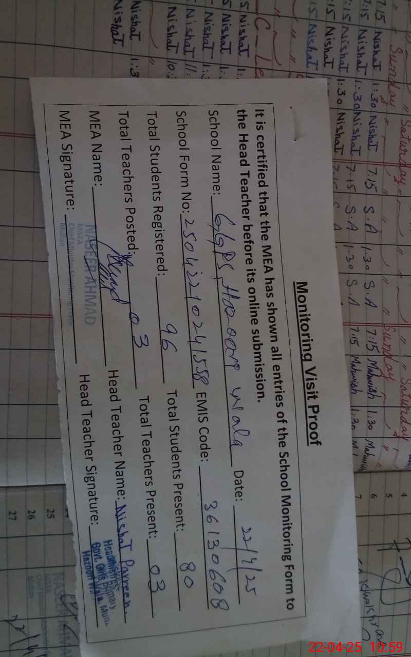 | EMIS Code: 36130608 | Name of School: GGPS HAZOORI WALA MULTAN | |||
