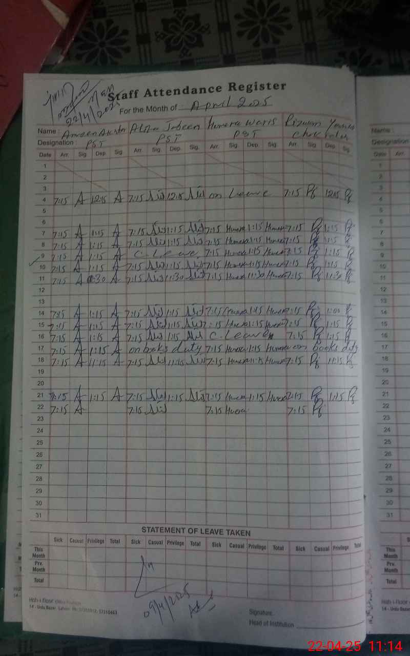 | CNIC | Full Name | Designation | R/C | Absence During Last Calender Month |