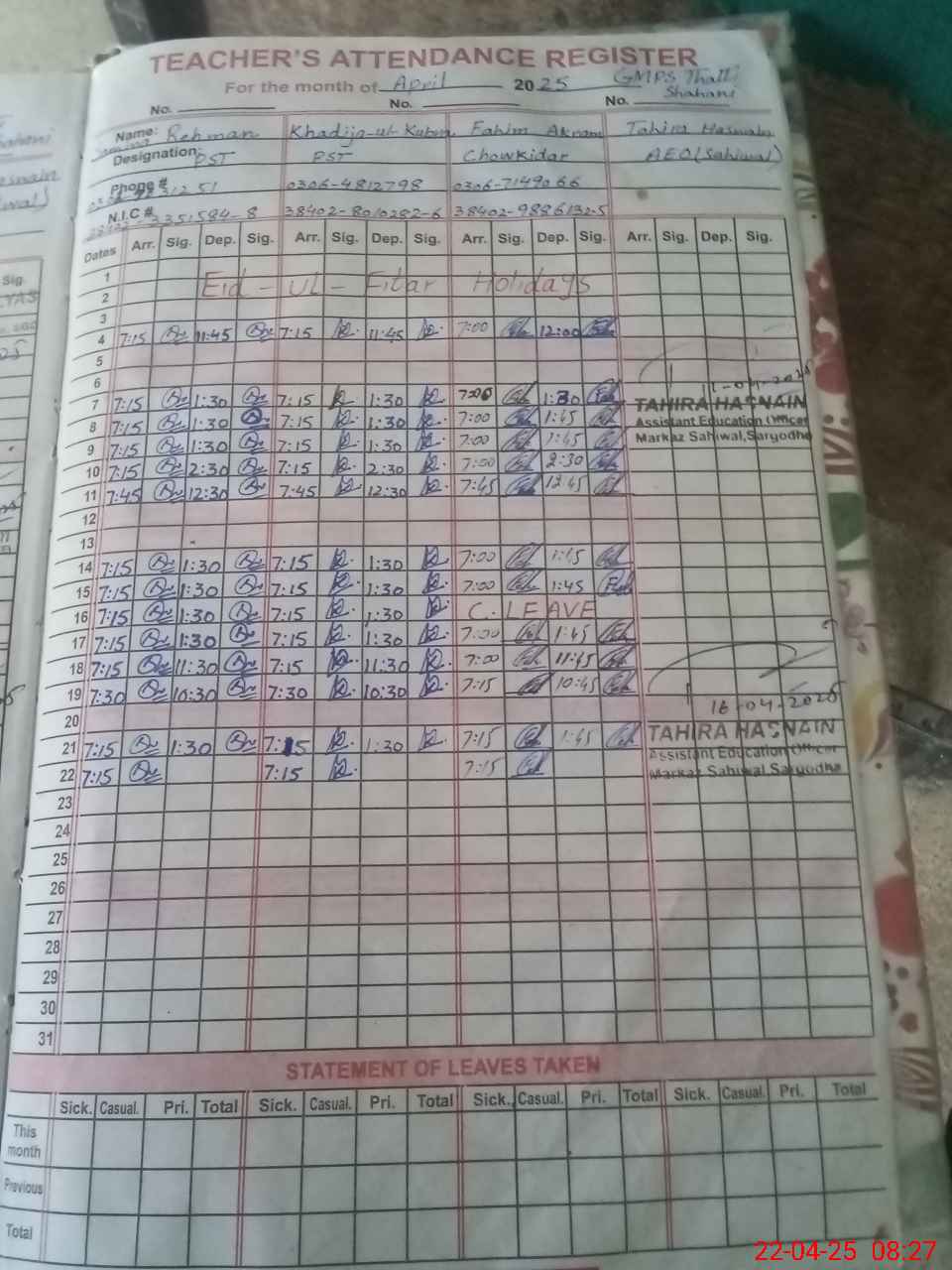 | District: SARGODHA | Tehsil: SAHIWAL | Markaz: SAHIWAL - FEMALE | Level: Primary | |