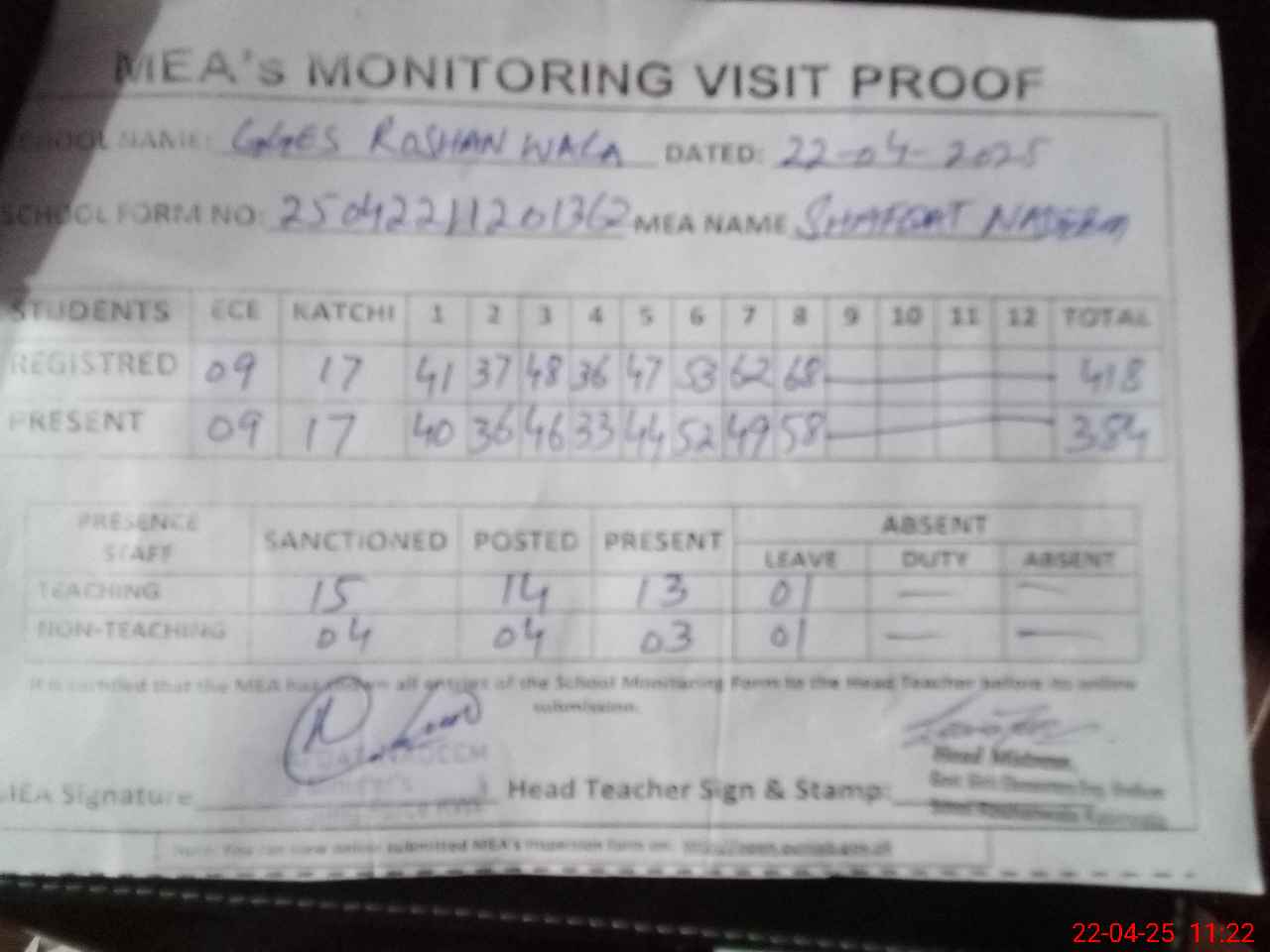 | EMIS Code: 36410333 | Name of School: GGES ROSHAN WALA, KABIRWALA | |||