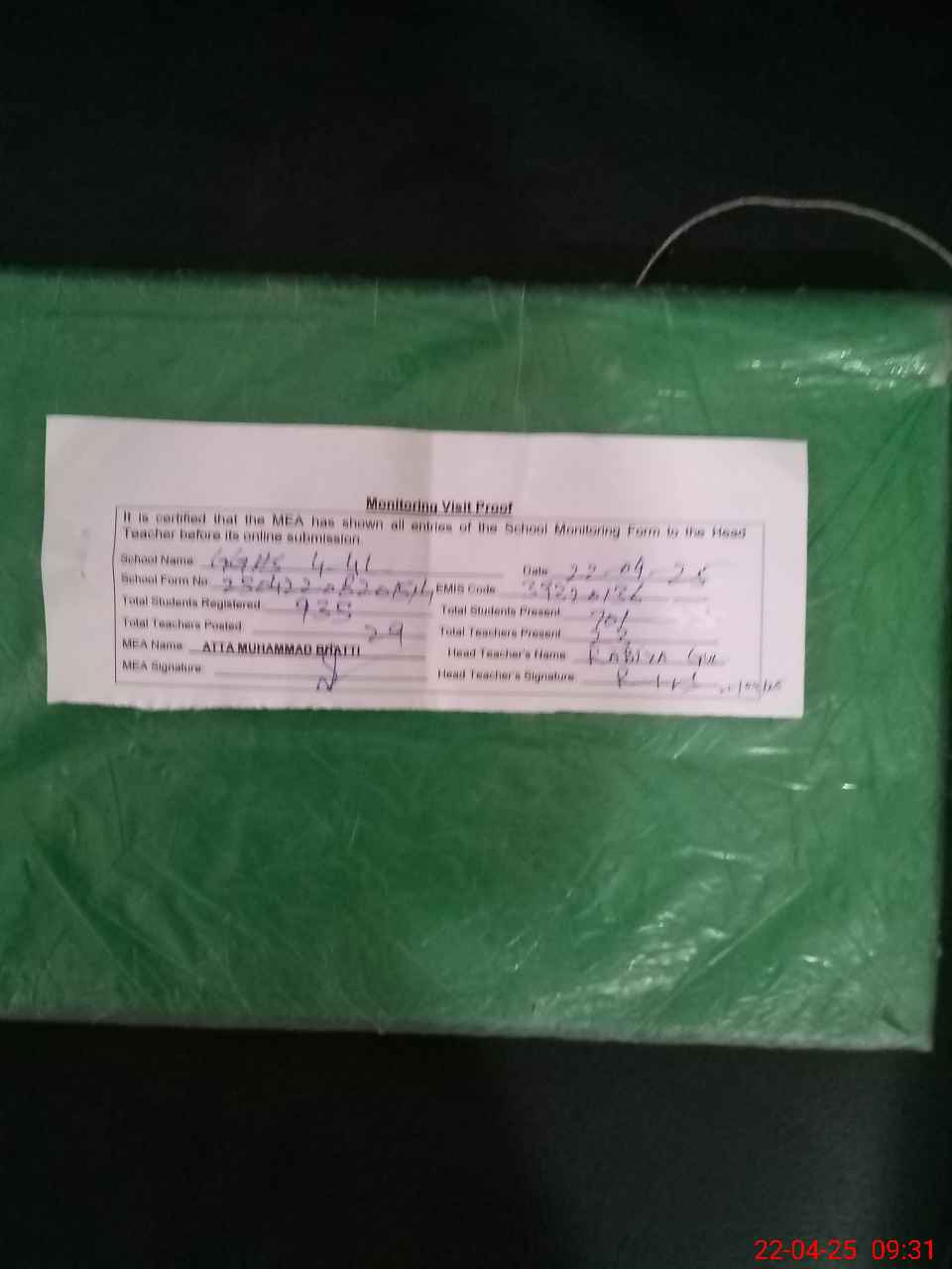 | Attendance Register | Head Teacher | MEA with School | Visit Proof |