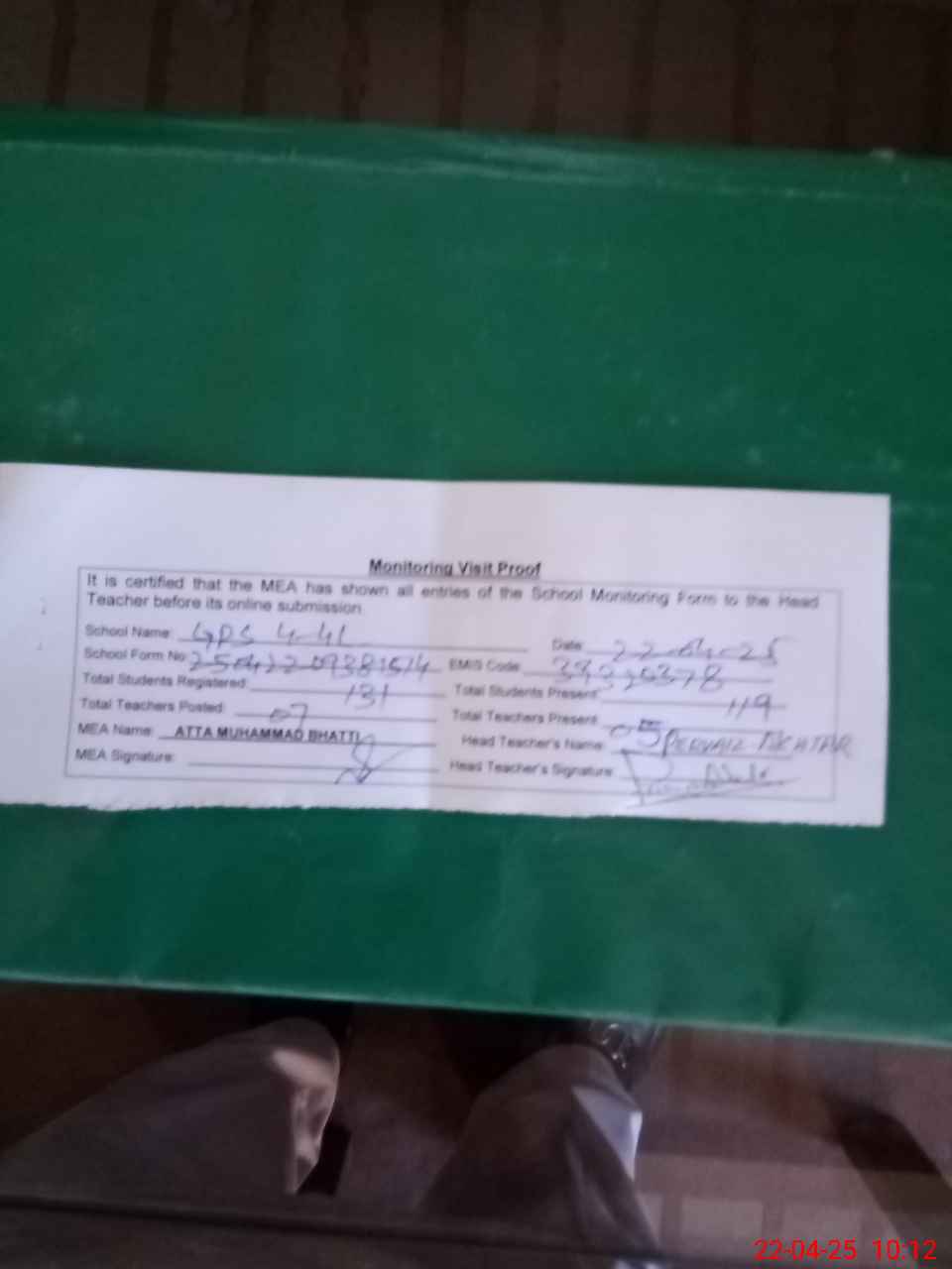 | Attendance Register | Head Teacher | MEA with School | Visit Proof |
