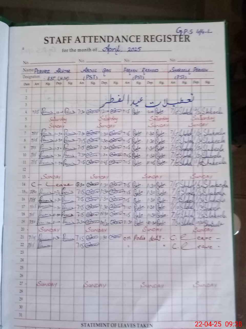 | CNIC | Full Name | Designation | R/C | Absence During Last Calender Month |