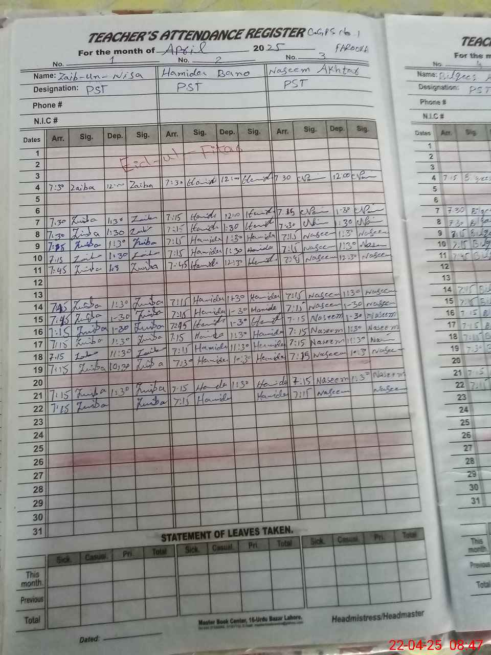 | CNIC | Full Name | Designation | R/C | Absence During Last Calender Month |