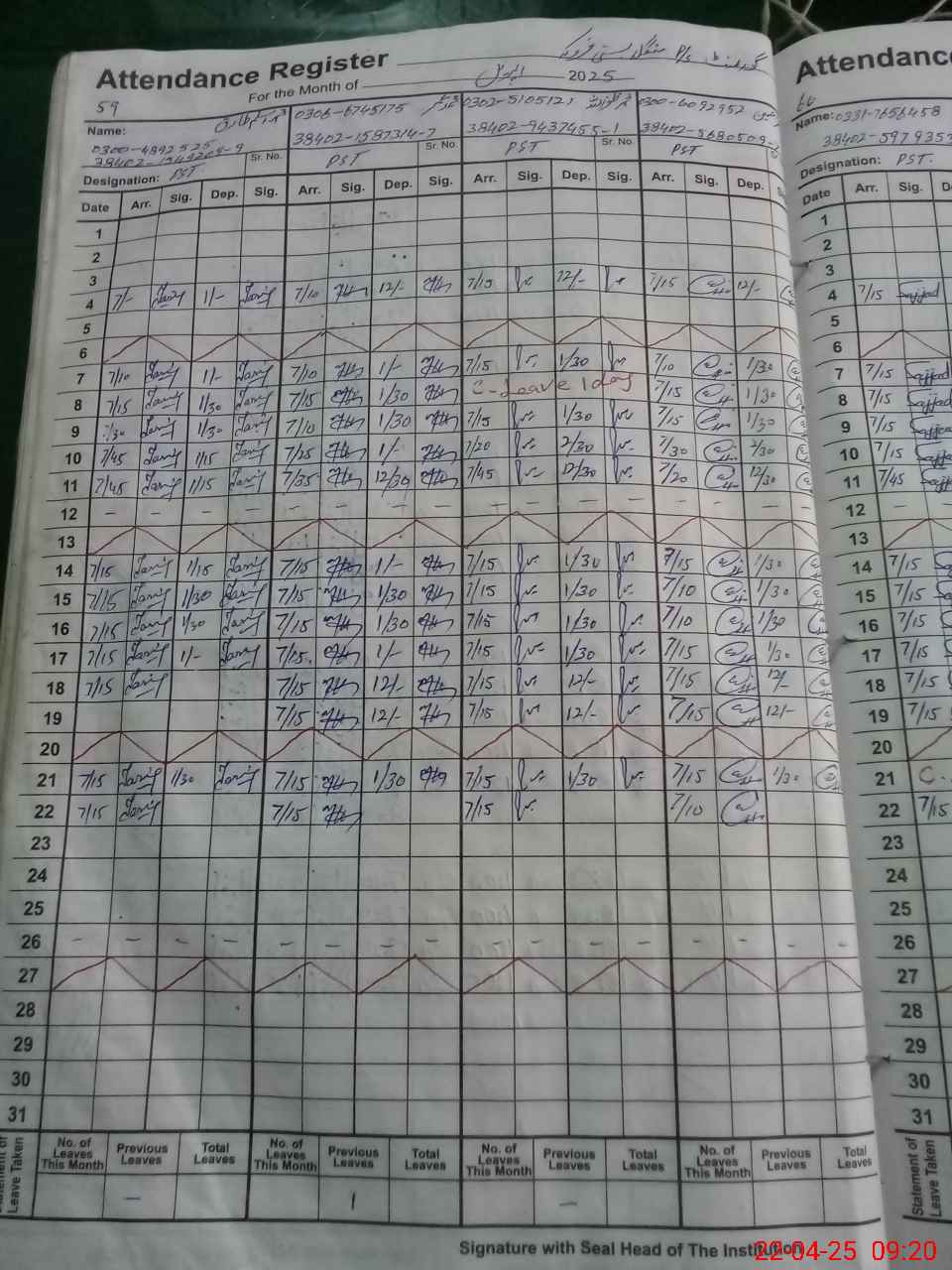 | CNIC | Full Name | Designation | R/C | Absence During Last Calender Month |