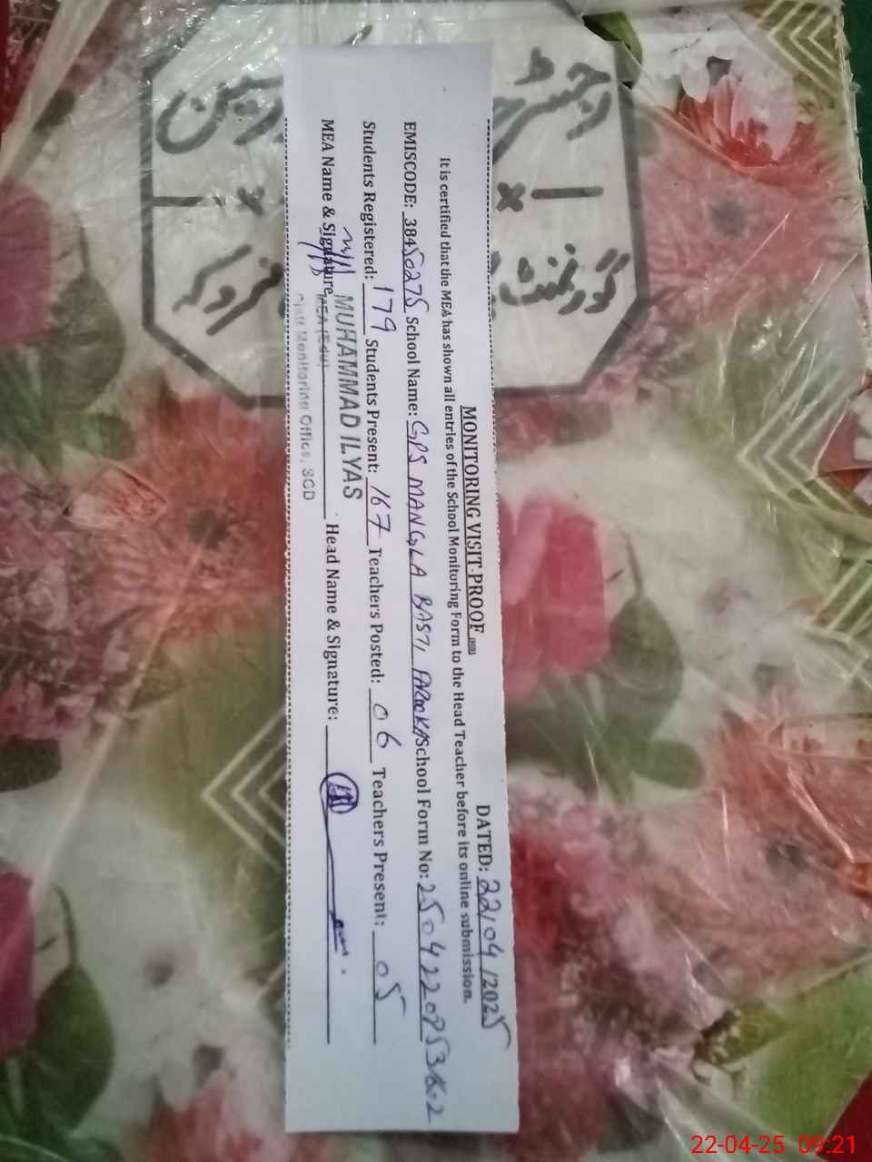| Certified that this School was Inspected by the Undersigned MEA/DMO Today and the Information Stated Above is as Per Record. | |||||