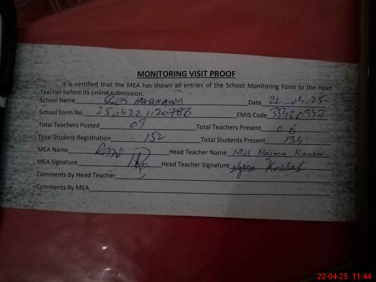 | Attendance Register | Head Teacher | MEA with School | Visit Proof |