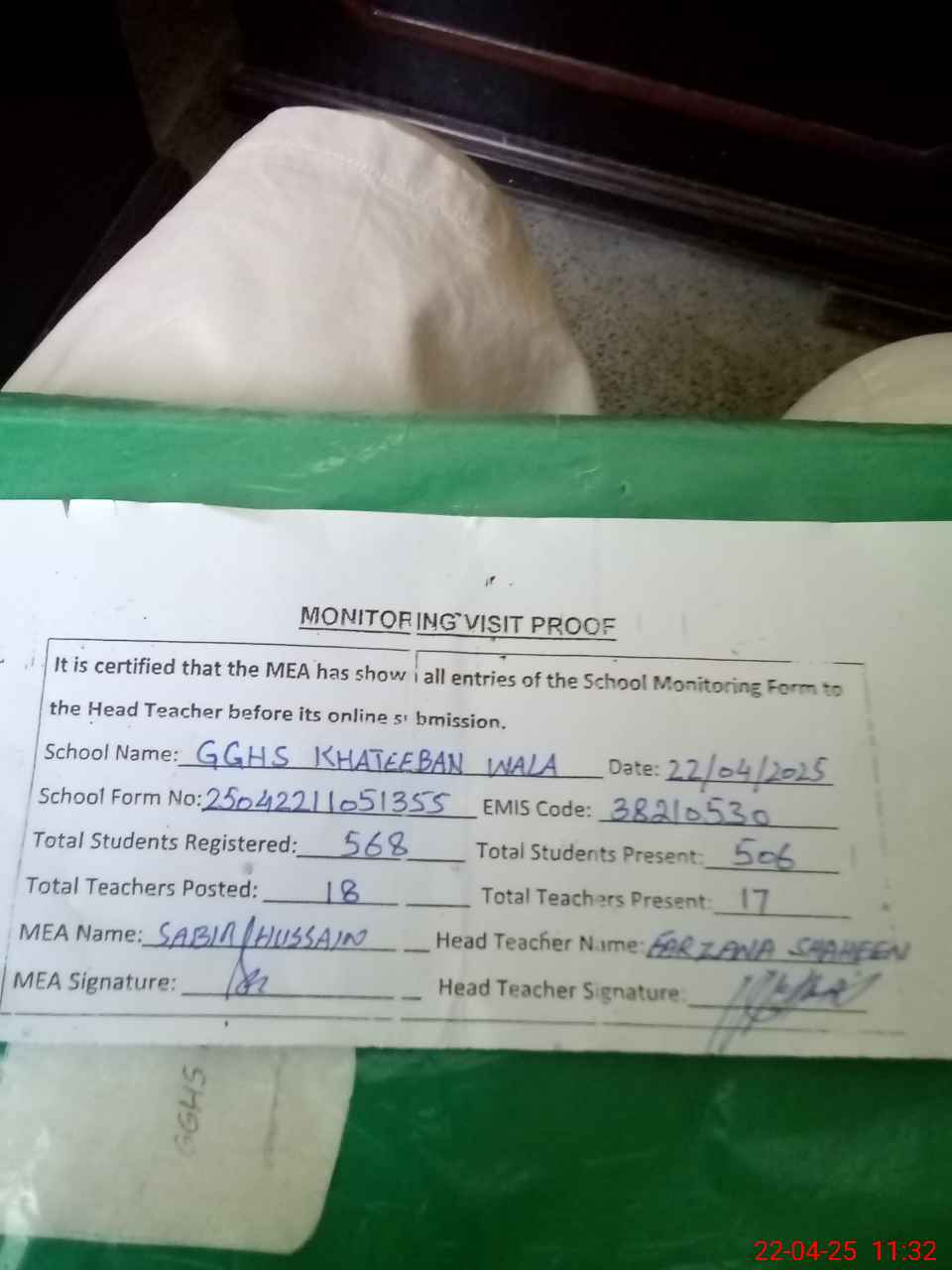 | Attendance Register | Head Teacher | MEA with School | Visit Proof |