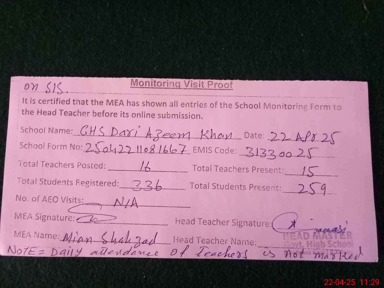 | EMIS Code: 31330025 | Name of School: GHS DARI AZEEM KHAN | |||