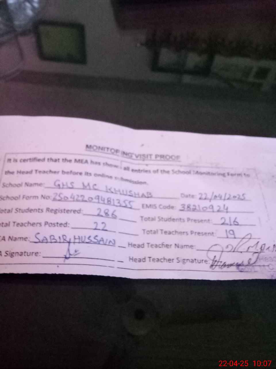 | EMIS Code: 38210924 | Name of School: GHS MC KHUSHAB | |||
