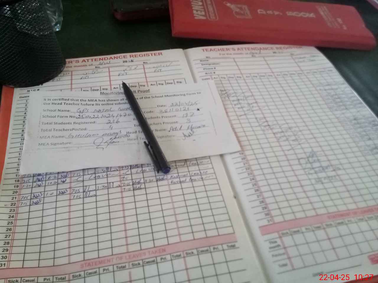 | Attendance Register | Head Teacher | MEA with School | Visit Proof |