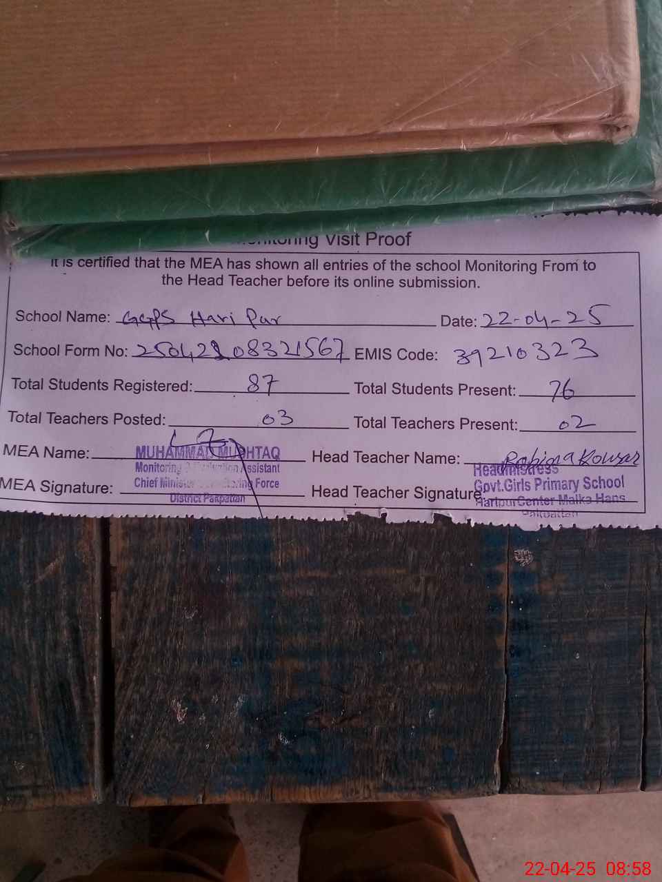 | EMIS Code: 39210323 | Name of School: GGPS HAREE PUR | |||