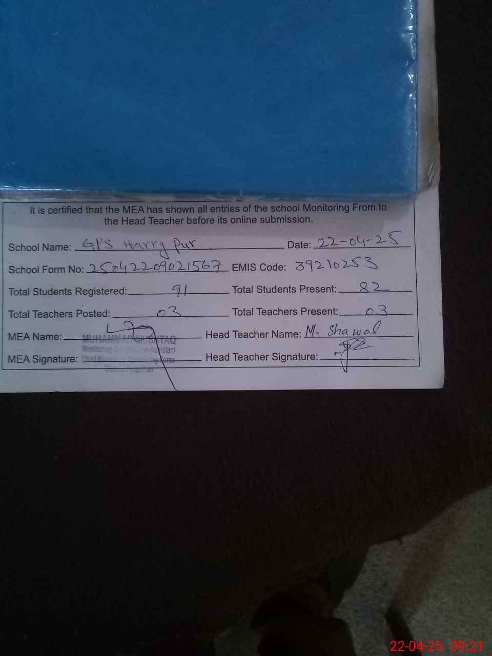 | Attendance Register | Head Teacher | MEA with School | Visit Proof |