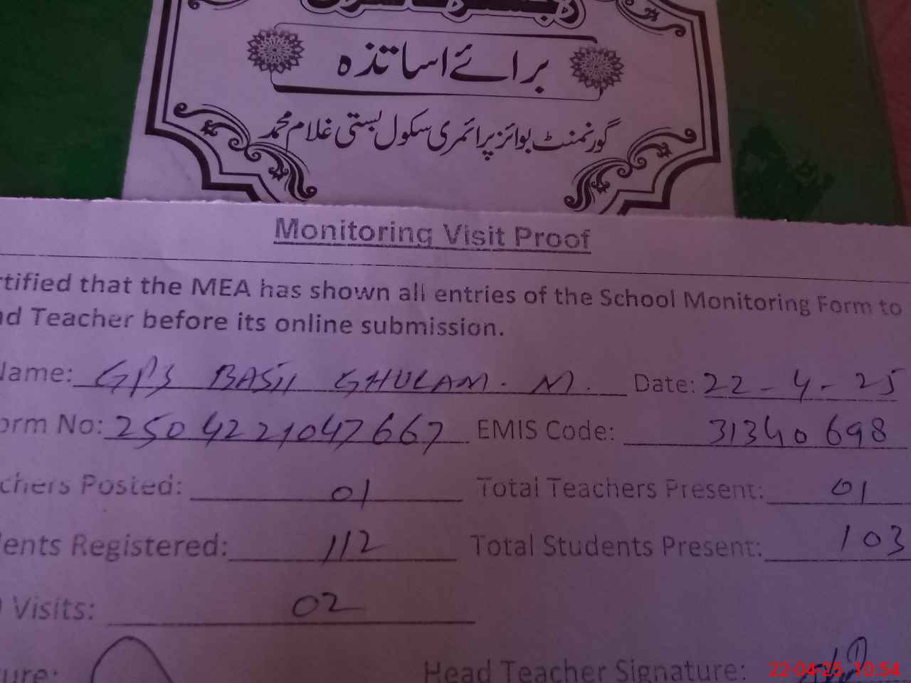 | Attendance Register | Head Teacher | MEA with School | Visit Proof |