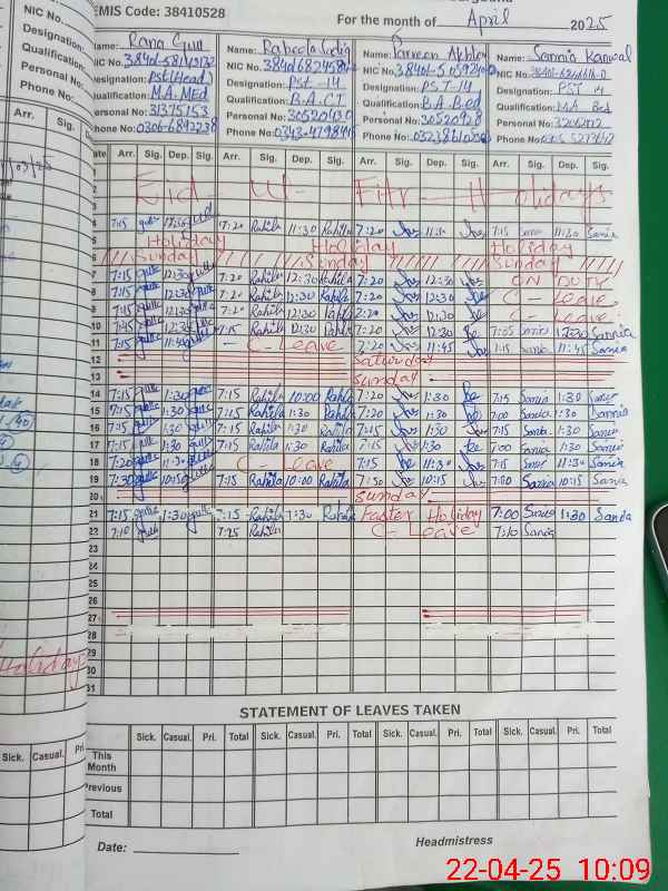 | CNIC | Full Name | Designation | R/C | Absence During Last Calender Month |